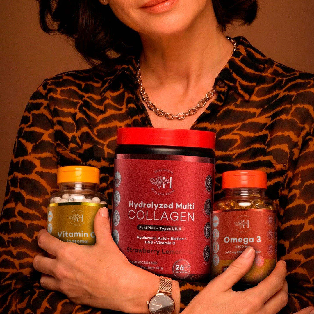 Este combo reúne tres esenciales que trabajan en sinergia para mejorar su piel, fortalecer sus defensas, reducir inflamación y darle claridad mental en una etapa donde el cansancio y el estrés se sienten más que nunca.
